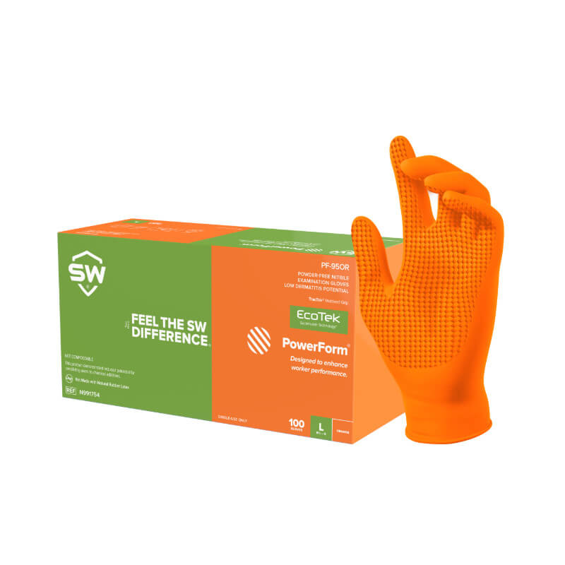 Los guantes de examen de nitrilo PF-95OR TracTek en color naranja de alta visibilidad permiten trabajar con confianza en entornos húmedos y aceitosos. Su tecnología Performance Grip reduce la tensión en las manos, aumentando el control. Incorporan la tecnología TracTek® Grip para maximizar el contacto con la superficie y canalizar líquidos, además de la tecnología sostenible EcoTek® sin pérdida de rendimiento. Son compatibles con pantalla táctil, libres de silicona para entornos críticos, con grosor óptimo para durabilidad y sensibilidad táctil, y cuentan con un puño con reborde resistente al desgarro. Cumplen con un AQL de 1.5, superando los estándares de laboratorio. Aplicaciones típicas: uso médico, manipulación de productos químicos y manipulación de líquidos.